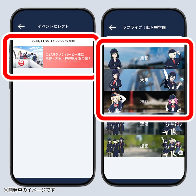 キャンペーン期間中は【ニジガクメンバーと一緒に京都・大阪・神戸観光 空の旅!】のバナーが表示されます。タップした後「撮影」を選択してください。