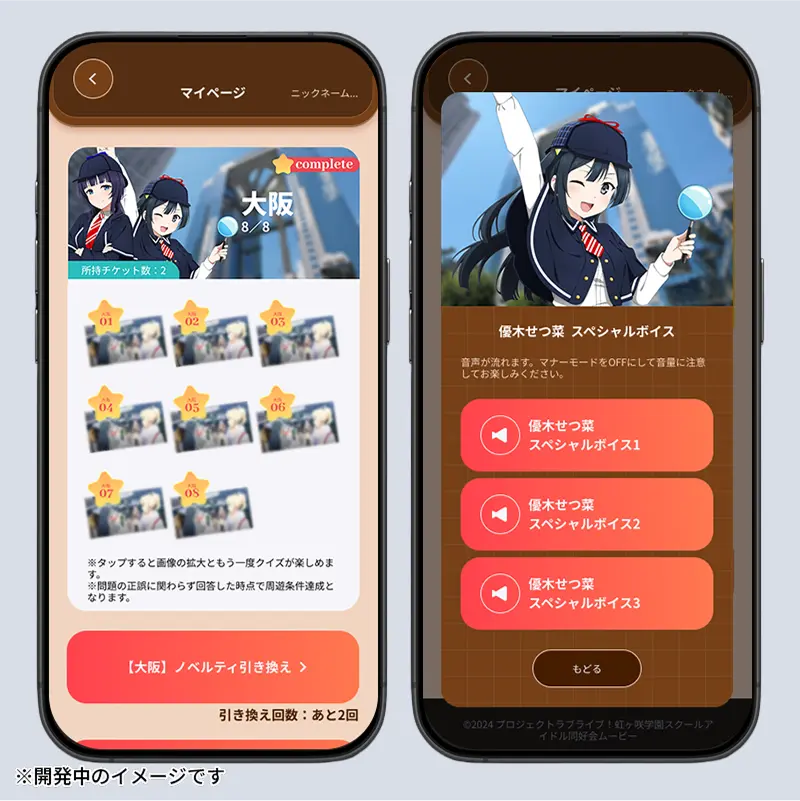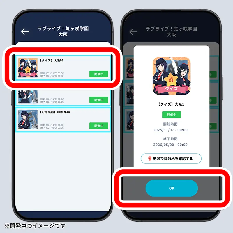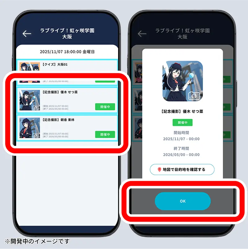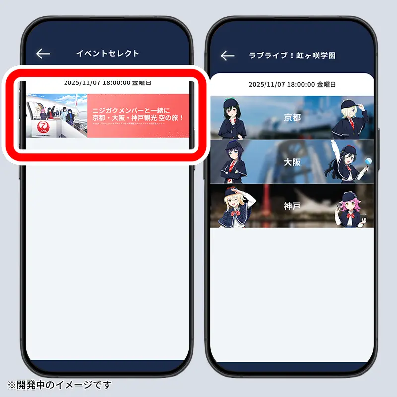 在活動期間,將顯示「與虹咲成員一起展開京都、大阪、神戶觀光空中之旅!」的橫幅。點擊後,選擇你所在的區域。